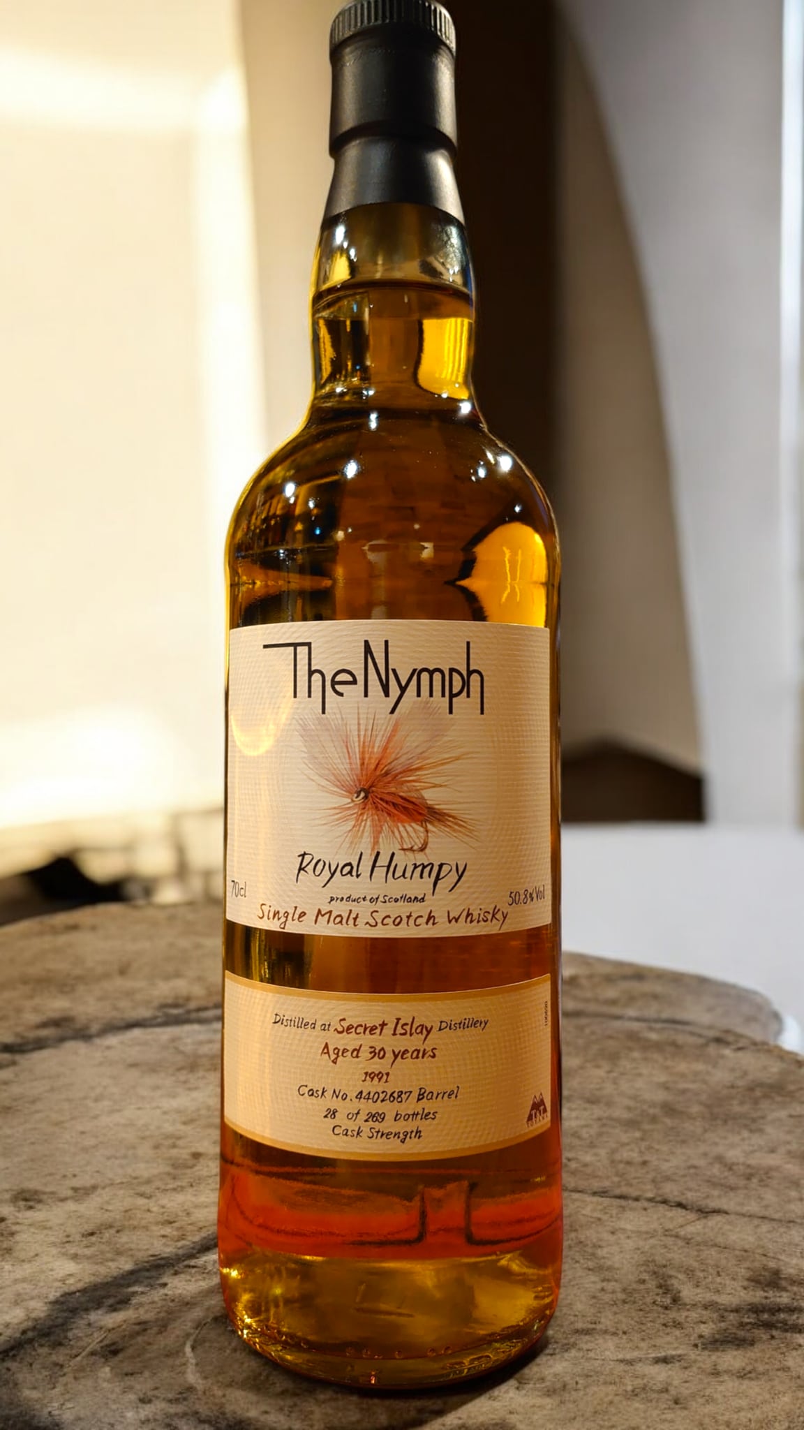 泉や川に美しい精霊ニンフが住むように、美味しいウイスキー樽には美しい精霊が宿るのではないか。The Nymph(ザ・ニンフ)はそんな思いから生まれたプライベートブランドです。今回はザ・ニンフのシリーズから、長期熟成のシークレットアイラをリリースさせて頂きます。蒸留所名は名乗れませんが、アイラ島南岸にあり、イギリス国王との関係が深いことでも知られる蒸留所です。香味は、その蒸留所らしい海藻を思わせるヨードとピートスモーク、そしてフルーティなニュアンスが個性として発揮されています。また、長期熟成による丸みあるボディと複雑かつ繊細な香味で、高い次元での一体感をもたらしています。大変貴重な長熟アイラを、ぜひご堪能ください。
