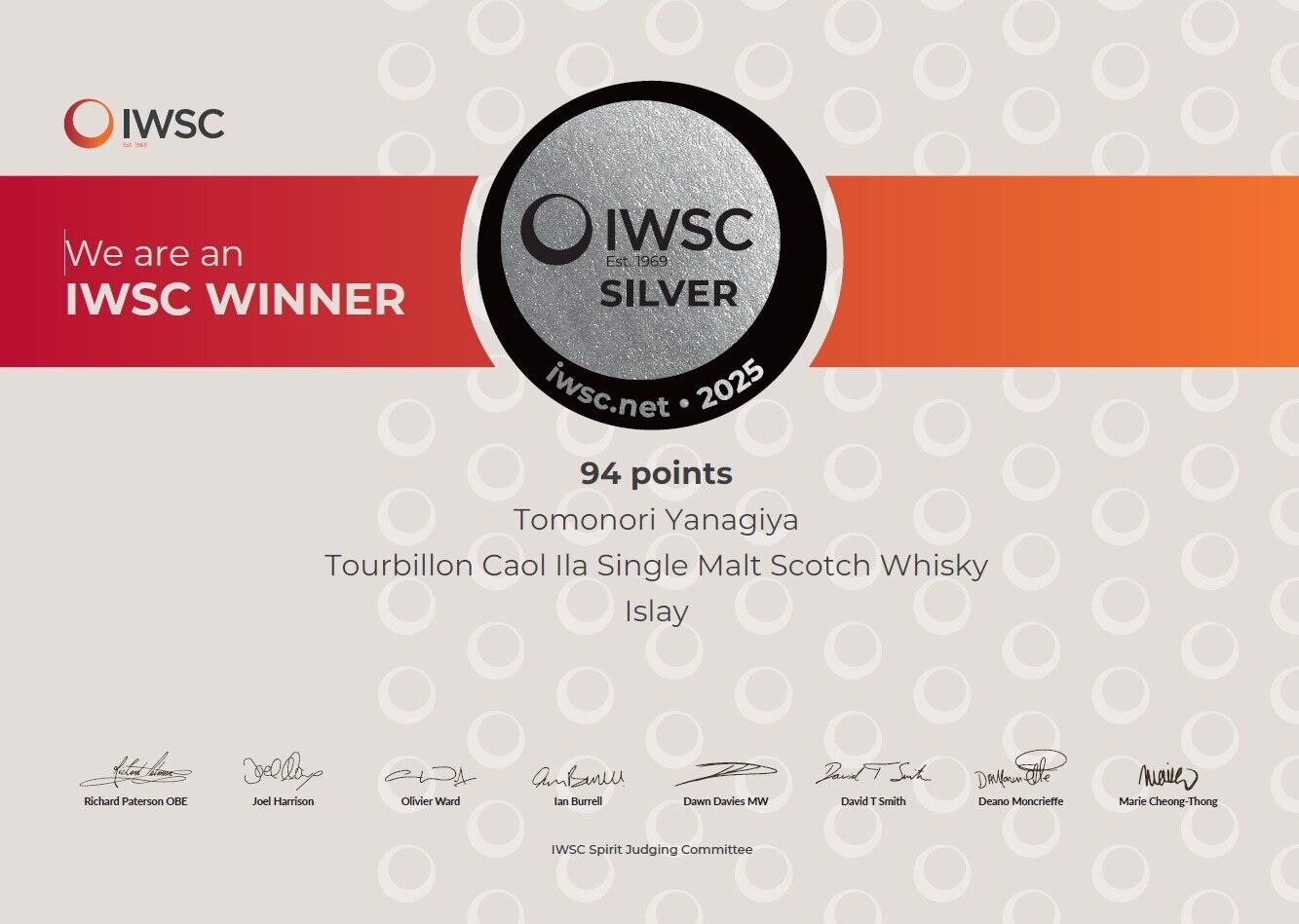 そして、なんと海底熟成ウイスキートゥールビヨン カリラ7年が、94ポイントでシルバーを受賞しました。95点以上が金賞ですので、シルバーの最上級の評価をいただいたのです。