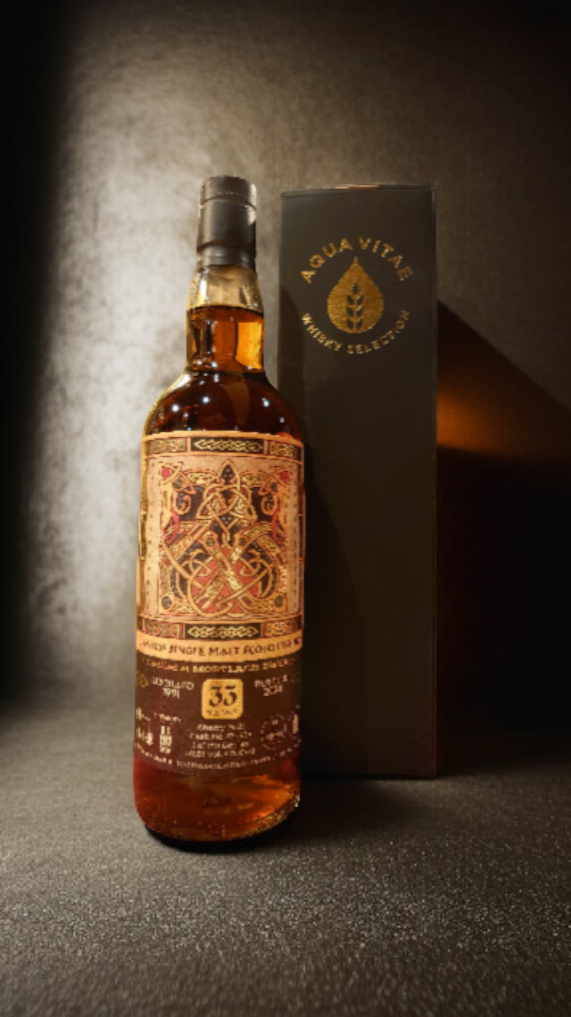 今回御案内させて頂く一樽は、「ウイスキー専門店相葉」様向けに特別なウイスキーをボトリングさせて頂きました。良質な樽の目利きで知られている、台湾・高雄の“AQUAVITAE WHISKY SELECTION” アレン・チェン氏 の特別なサポートにより、スコットランドより取り寄せた、厳選された一樽。市場でも非常に稀有な存在である、30年熟成オーバーのシェリーカスクの長期熟成モートラック 33年原酒をシングルカスク・カスクストレングスでボトリング致しました。