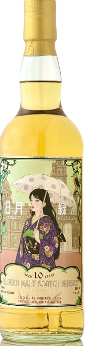 背景は、グラスゴー市議会議事堂。今回の枠は、グラスゴーの市章の4つのモチーフ、詩にある「飛ばなかった鳥、育たなかった木、鳴らなかった鐘、泳がなかっ た魚」。守護聖人マンゴーの奇跡の話から。女性は、テイスティングコメントからイメージして頂き、 綺麗な黒髪のお嬢様。可愛くて上品でありつつ、ツンとした雰囲気も。落ち着いた紫に華やかな柄 の着物、可愛らしい水玉の日傘。今回の製造は海外スコットランドの蒸留所ですので、これまでの 和傘ではなく洋傘仕様になっております。