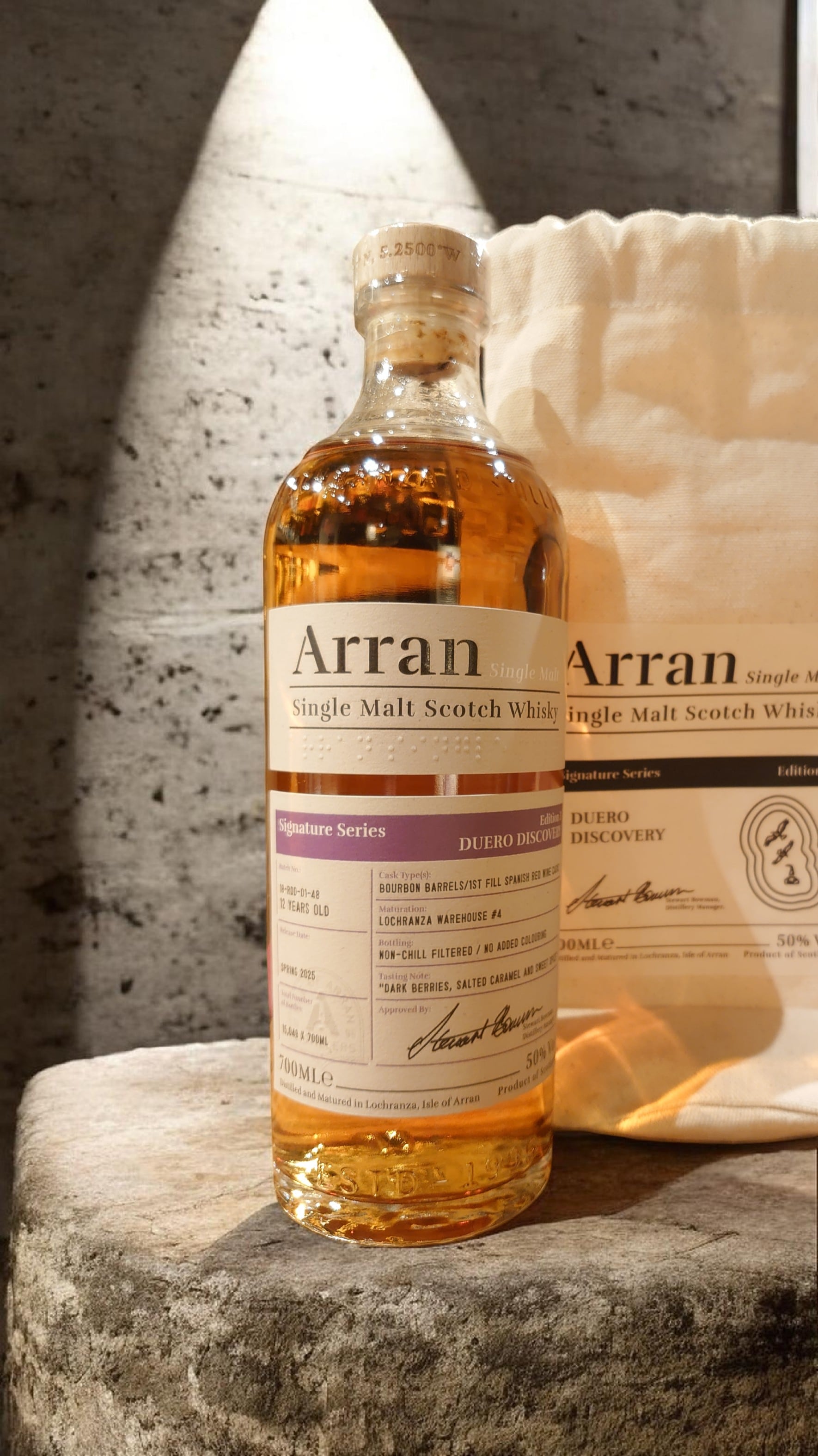 ファーストフィルおよびセカンドフィルのバーボンバレルで6年熟成後、スペイン最高峰ワインを輩出する銘醸地、リベラ・デル・ドゥエロの赤ワインの空き樽で6年間追熟した12年熟成の限定商品で、ノンチルフィルタード、ノンカラーリングボトリング